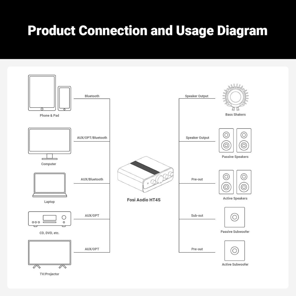 Le Fosi Audio HT4S est un amplificateur de puissance Bluetooth 4 canaux compact, conçu pour les systèmes audio domestiques ou multi-pièces. Compatible avec Bluetooth 4.1/5.0 selon la version, il offre une connexion sans fil stable et rapide, en plus d’une entrée RCA stéréo pour sources filaires. Il peut alimenter deux paires de haut-parleurs ou être utilisé en bi-amplification.