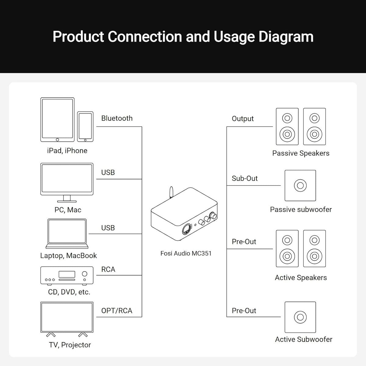 Le Fosi Audio MC351 est un amplificateur HiFi tout-en-un 2.1 canaux doté d’un DAC intégré, idéal pour les amateurs de son vintage avec un style moderne. Il permet d’alimenter deux haut-parleurs stéréo et un caisson de basses actif avec une puissance remarquable, tout en prenant en charge les connexions numériques modernes.